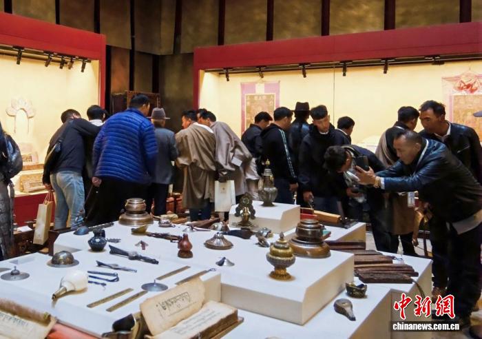图为观众正在欣赏展览中的藏品。西藏唐卡艺术博物馆供图