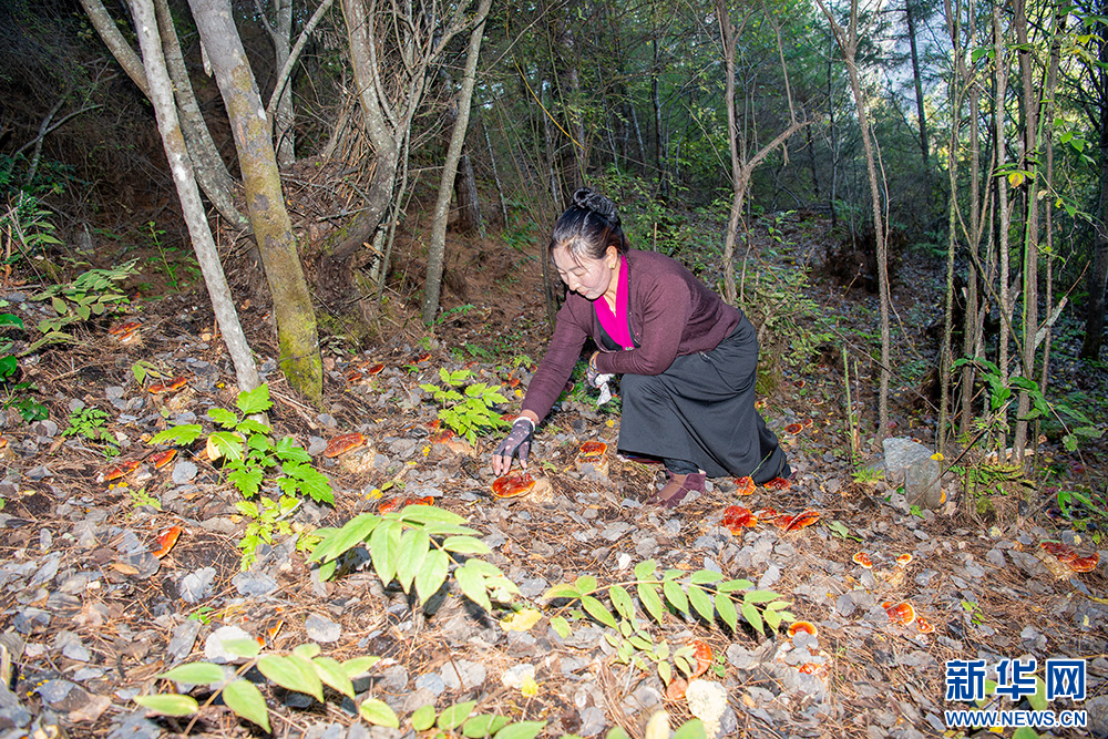 西藏山南市洛扎县拉康社区村民在社区股份经济合作社仿野生试种基地观察灵芝长势(10月10日摄)。新华网 旦增努布 摄