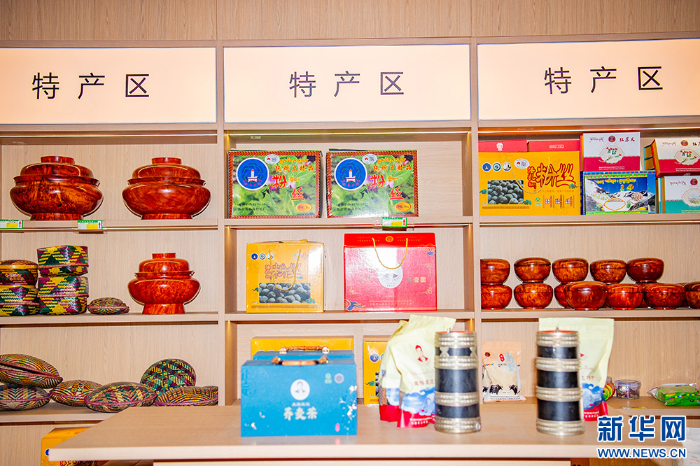 10月11日拍摄的西藏山南市洛扎县谢翁温泉酒店柜台内展示的洛扎县农牧产品。新华网 旦增努布 摄