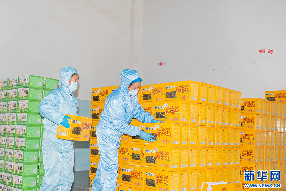 10月12日拍摄的西藏山南市洛扎县粉丝厂员工在库房摆放农特产品。新华网 旦增努布 摄
