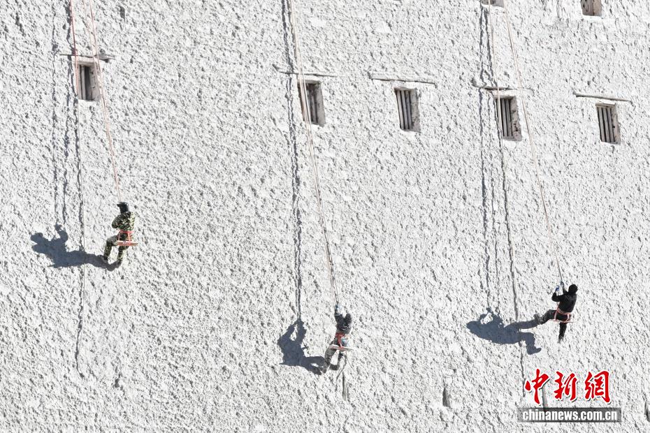 10月24日,西藏布达拉宫管委会的专业工作人员化身“蜘蛛人”悬于半空泼洒涂料,成为宫墙之上的独特风景。这一延续300余年的传统,是雨季过后保护墙体的关键举措。中新社记者 贡嘎来松 摄