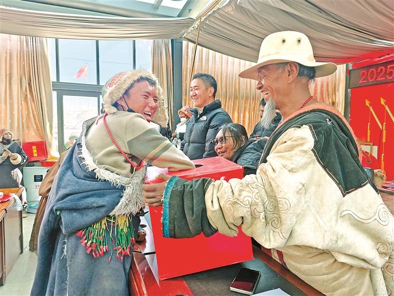 在日土县热帮乡扎普村,村委会大院里却异常热闹,乡亲们正围坐在一起,一边喝着香喷喷的酥油茶,一边拉着家常。