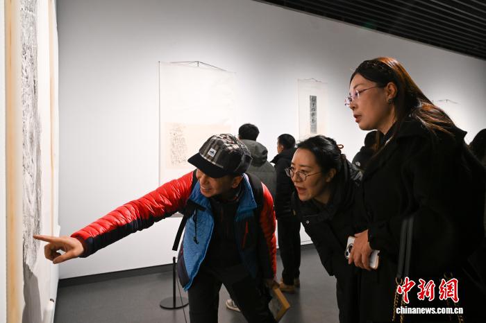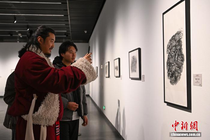 图为观众欣赏展览中的岩画石刻拓片作品。中新社记者 贡嘎来松 摄