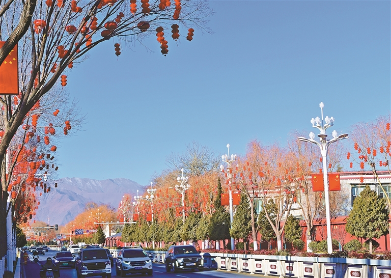 春节、藏历新年临近,拉萨街头年味渐浓。近日,在拉萨主城区多条街道,市政工人正忙着悬挂灯笼。放眼望去,鲜艳的灯笼如累累果实般点缀着冬日街景,在高原的阳光照耀下显得格外喜庆。