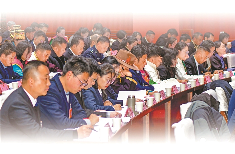 林芝市人大代表认真聆听政府工作报告。