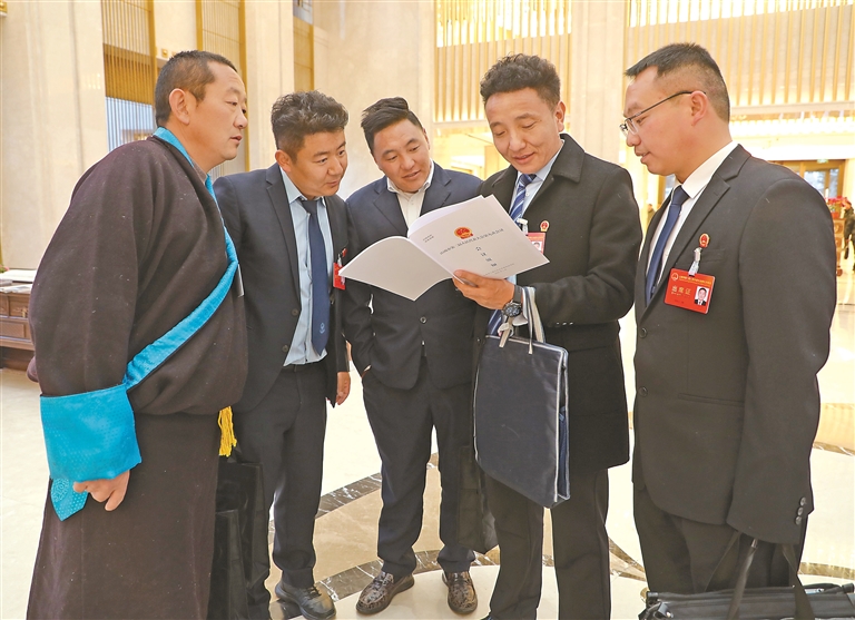 图为山南市人大代表一起了解会议议程。