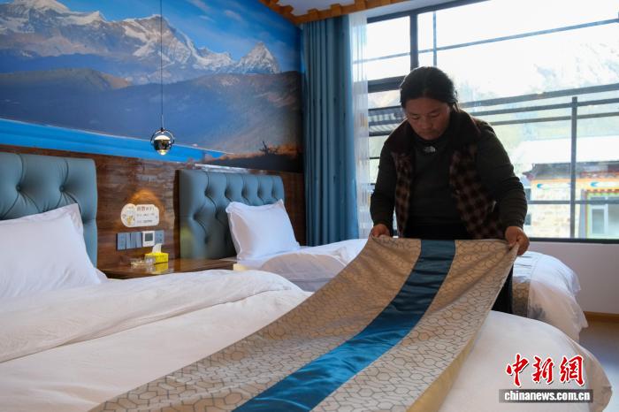 2025年11月9日,西藏林芝巴松措景区结巴村村民索朗拉姆整理客房,据悉,她的客栈拥有15间客房。江飞波 摄
