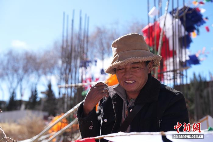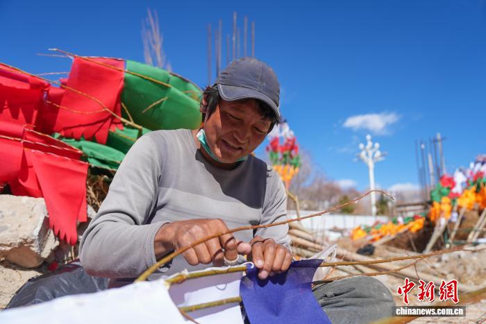2月5日,临近藏历新年,在西藏自治区拉萨市街头,农牧民正缝制五彩经幡树。五彩经幡树是藏族民众在藏历新年前必备的年货之一。藏历新年期间,藏族民众会选择一个良辰吉日,为自家的房顶更换五彩经幡树,祈求新的一年里五谷丰登,吉祥如意。图为格桑扎西正在缝制五彩经幡树。贡确 摄