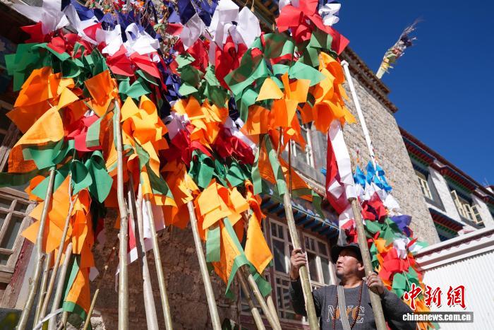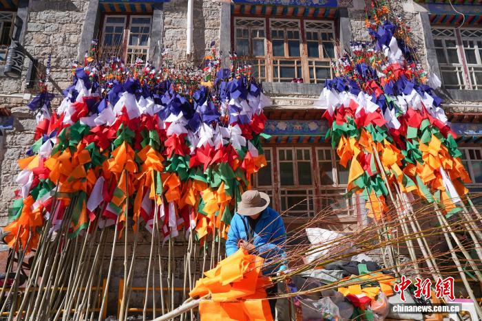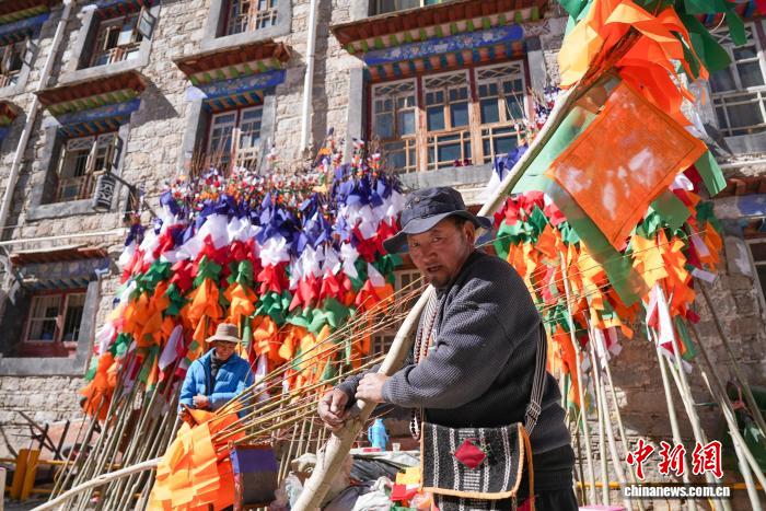 2月5日,临近藏历新年,在西藏自治区拉萨市街头,农牧民正缝制五彩经幡树。五彩经幡树是藏族民众在藏历新年前必备的年货之一。藏历新年期间,藏族民众会选择一个良辰吉日,为自家的房顶更换五彩经幡树,祈求新的一年里五谷丰登,吉祥如意。图为来尼木县的普琼扛着五彩经幡树。贡确 摄