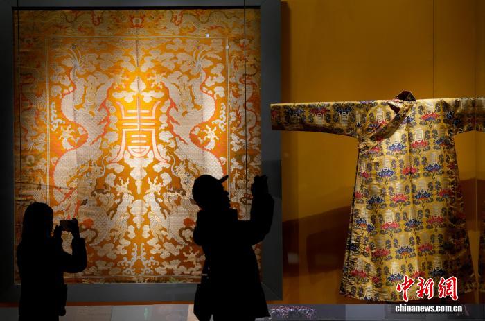 图为观众拍摄展览中的香色地彩云金龙暗八仙纹绒绣织成料。中新社记者 李林 摄