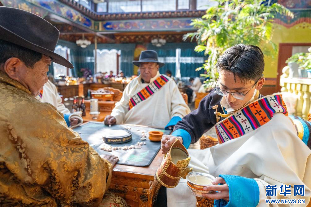 1月20日,西藏日喀则市桑珠孜区聂日雄乡楚松村村民多吉旺堆家的晚辈在给长辈敬青稞酒。新华网 旦增努布 摄