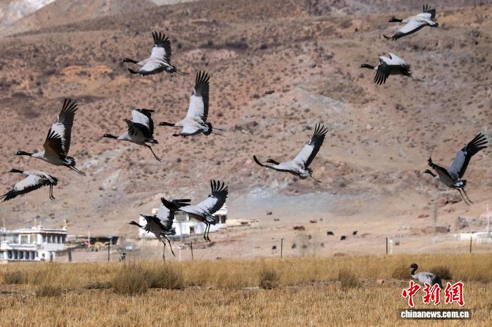 图为2月8日,黑颈鹤种群飞翔在高原农村周边。江飞波 摄