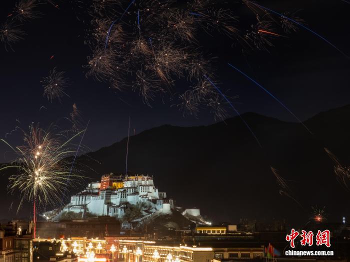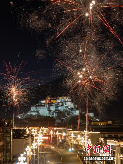 图为2月16日晚,拉萨北京东路烟花绽放与远处的布达拉宫交相辉映。中新社记者 江飞波 摄