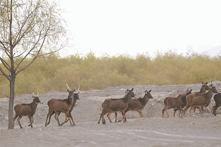 图为白唇鹿现身江畔草地。记者 洛桑平措 摄