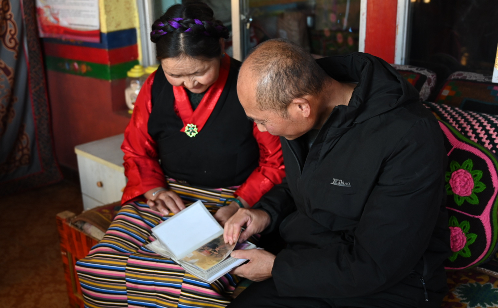 3月23日,央珍和徐文军夫妇在翻看照片。新华网发 刘蒙青 摄