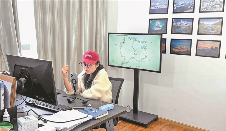 图为工作人员在直播间讲解西藏旅游的相关内容。
