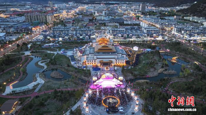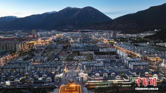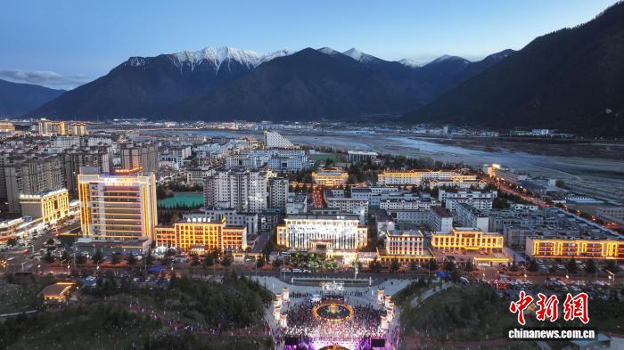 4月3日晚,西藏林芝市城市夜景美,城市建筑、街道的灯光与雪山相映成趣,景色美丽。(无人机照片)中新社记者 贡嘎来松 摄