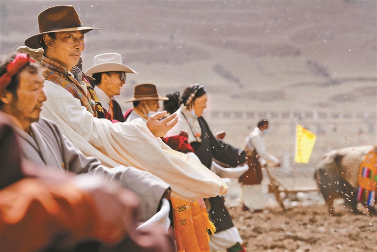 在那曲市索县首届高原春耕春播启动仪式上,身着盛装的农牧民群众共同播撒希望的种子。记者 汪纯 通讯员 索朗白姆 摄
