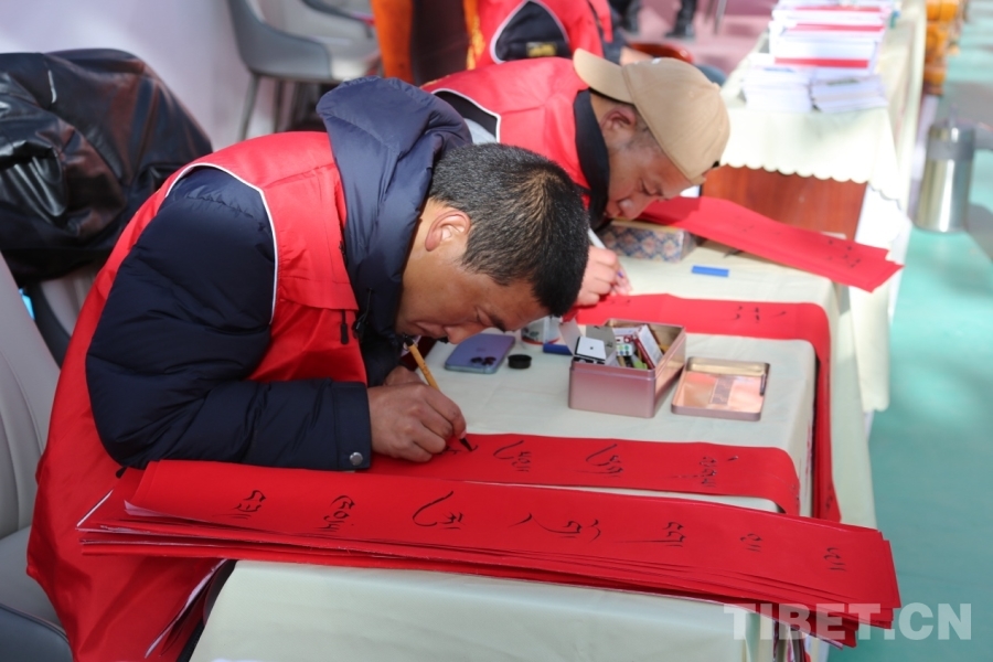 温暖物资发放区,保暖衣物、生活用品、学习用品等陆续送到群众手中。书法老师现场挥毫,书写一幅幅寓意吉祥的藏文春联赠予乡亲,为即将到来的新春增添浓浓年味与文化气息。