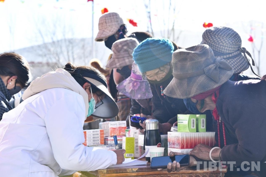 图为拉孜县锡钦乡“村晚”现场,医生正在为村民们义诊。摄影:赵振宇