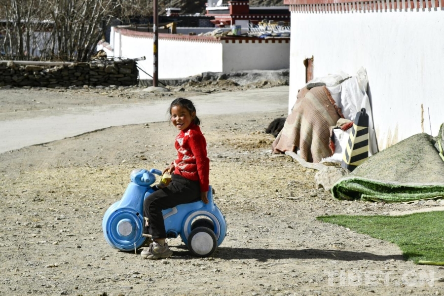 图为定日县长所乡古荣村内在自家新居前快乐玩耍的小女孩。摄影:赵振宇