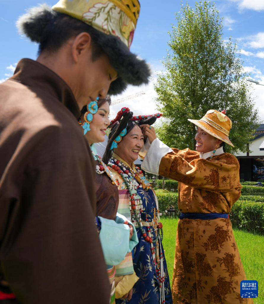 班珠丹塔(右一)在为模特调整藏装配饰(9月9日摄)。新华社记者 晋美多吉 摄
